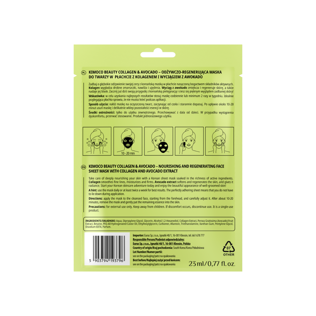 Kimoco Beauty Collagen&Avocado odżywczo - regenerująca maska do twarzy w płachcie z kolagenem i wyciągiem z awokado.