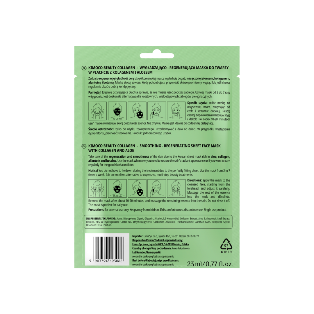 Wygładzająco – regenerująca maska do twarzy w płachcie z kolagenem i aloesem.