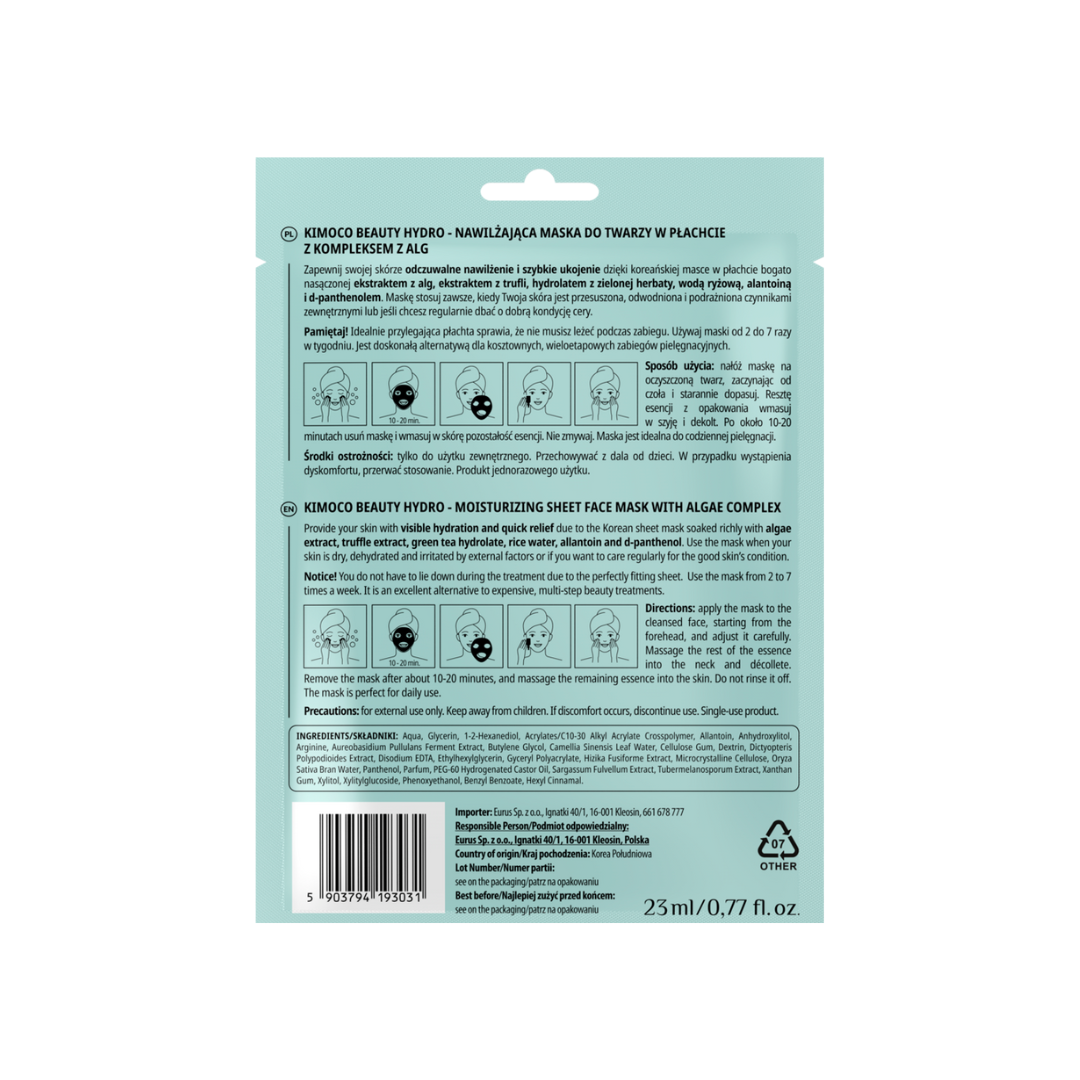 Nawilżająca maska do twarzy w płachcie z kompleksem alg.