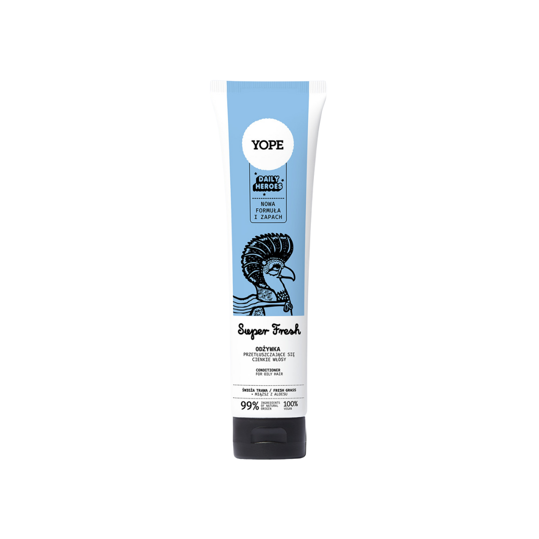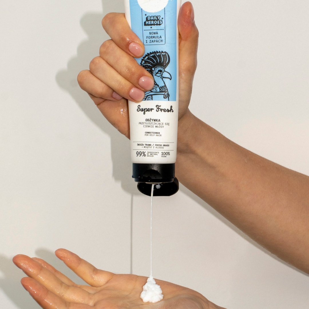 Odżywka do włosów przetłuszczających się i cienkich, Super Fresh z linii DAILY HEROES, to codzienny bohater w naturalnej pielęgnacji włosów bez objętości. Włosy dzięki niej będą łatwo poddadzą się szczotce czy grzebieniowi, będą świeże, elastyczne i uniesione.